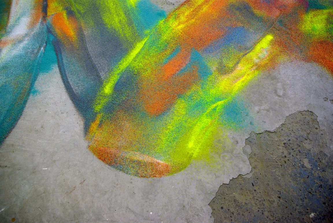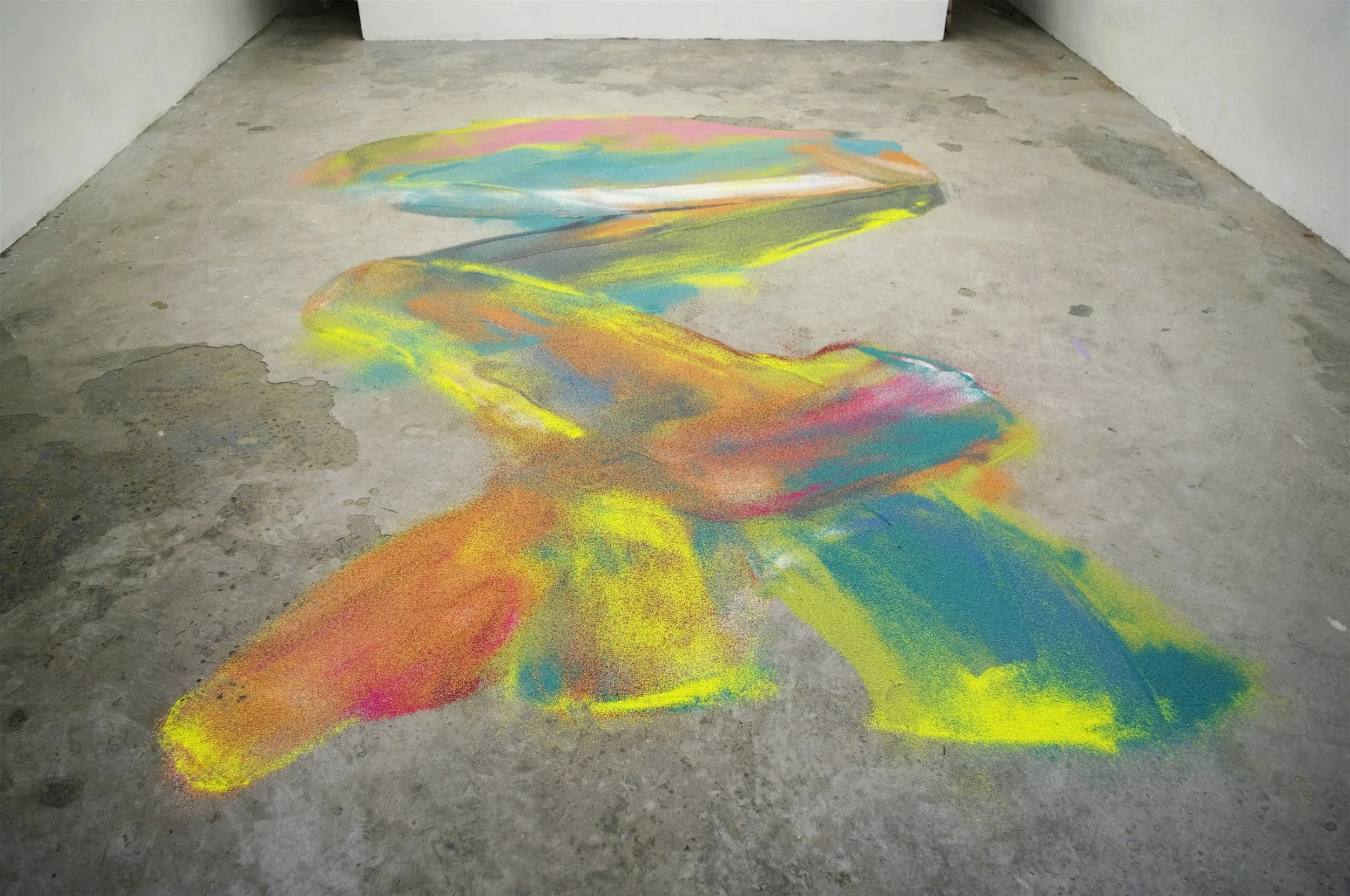 Substance of We Feeling is an ongoing series of temporary floor-based works made with sand. In this version, Substance of We Feeling (analysand), the work was made with synthetic coloured sand.