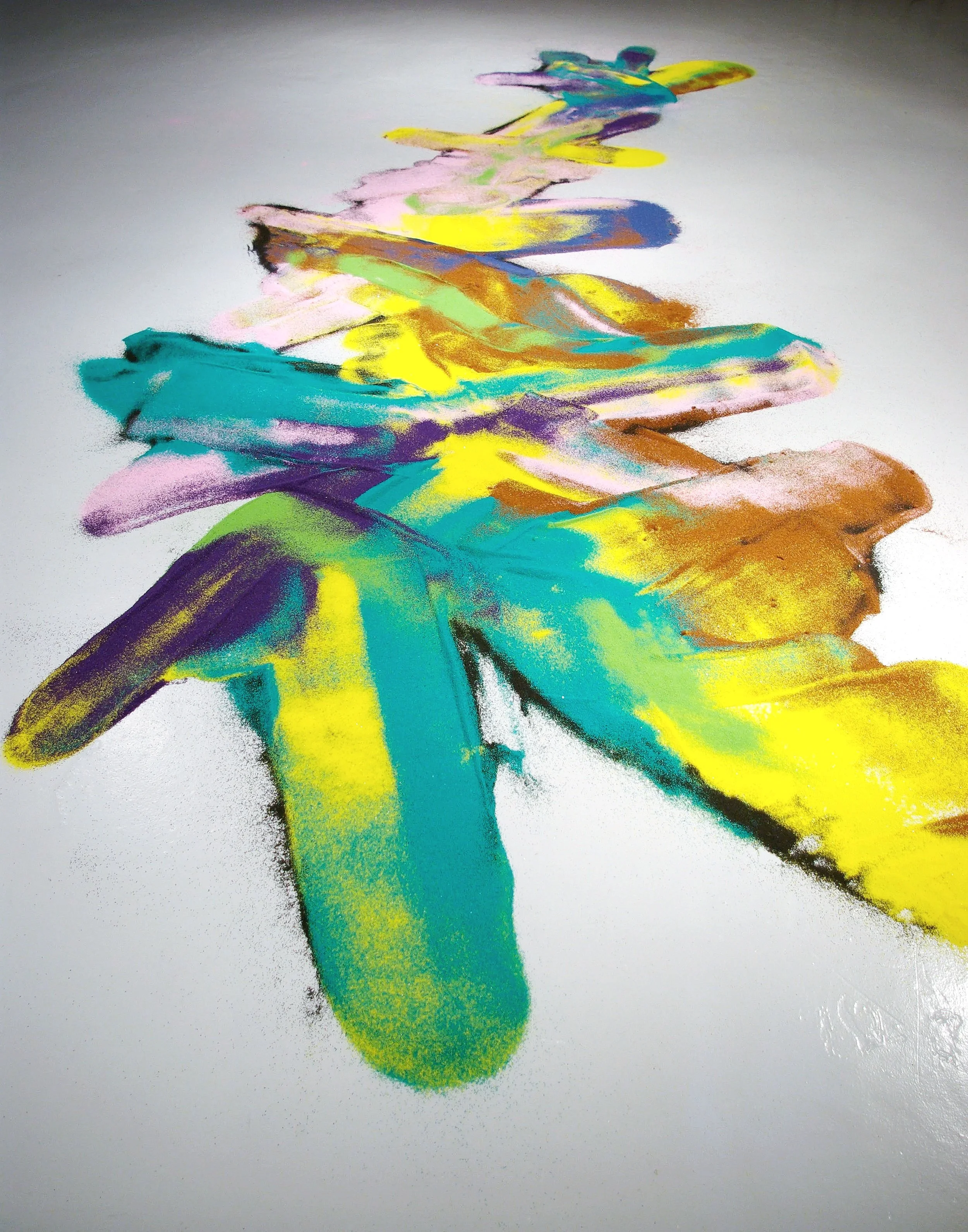 An ongoing series of temporary floor-based works made with sand. In this version was made with synthetic coloured sand. The title Substance of We Feeling is taken from the novel Shikasta (1979) by Doris Lessing.